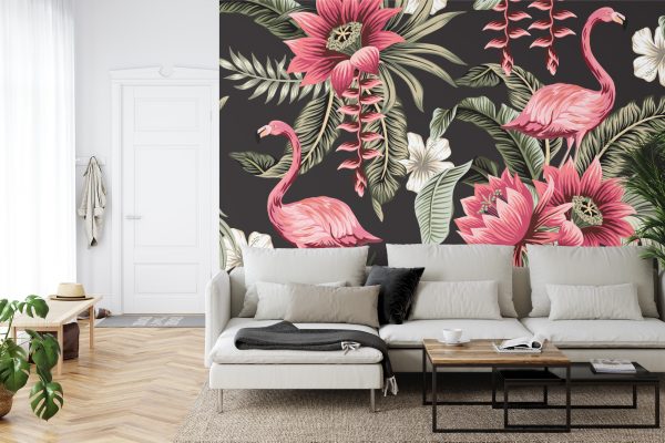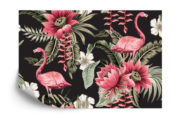 Papier Peint Fleurs Tropicales Et Flamants Roses Vintage
