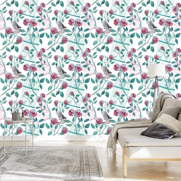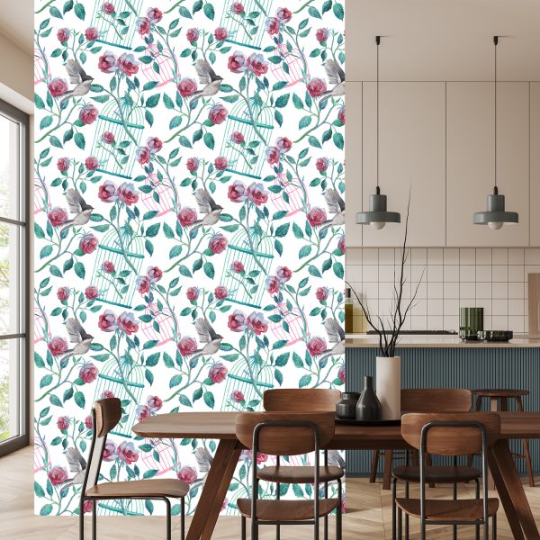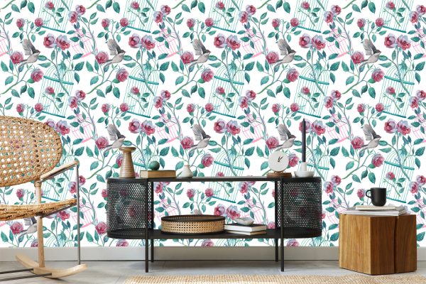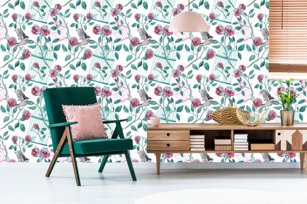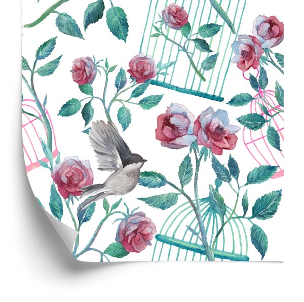 Papier Peint Oiseaux Cage Roses